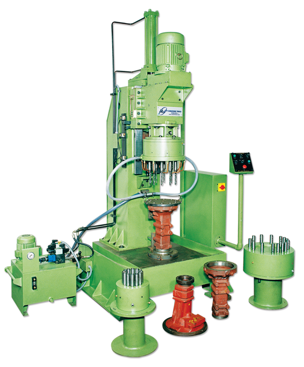 Drill Unit RVD 12-125 -P : 2 Nos Tap Unit RVT 16-60 : 2 Nos 2 Spindle Drill Head With Mobile Jig Bush Plate : 2 Nos 2 Spindle Tap Head : 2 Nos NO OF OPERATION 8 OPERATION CYCLE TIME 30 SEC Drilling Dia : 6.8 X 2 Nos Drilling Dia : 10.5 X 2 Nos Tapping M8 X 2 Nos Tapping M10 X 2 Nos Auto Lubrication Part Clamping Fixture